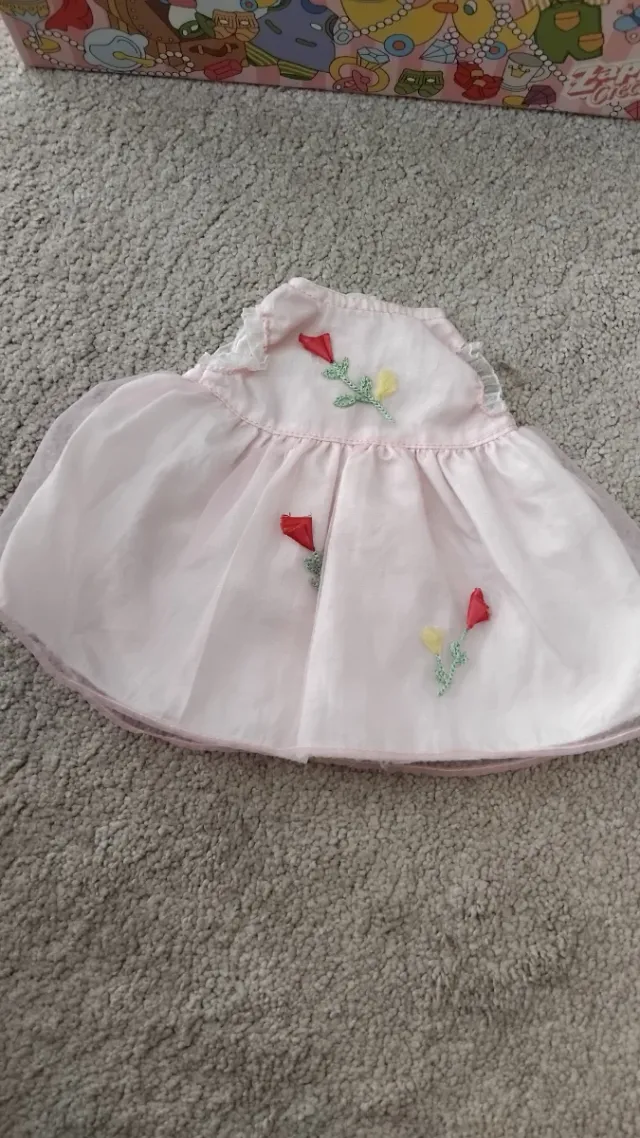 Vestido rosa para muñeca Nenuco con detalles de flores bordadas. - Diseño con volantes en el cuello. - Tejido ligero y vaporoso. - Adornos florales en tonos rojo y amarillo.