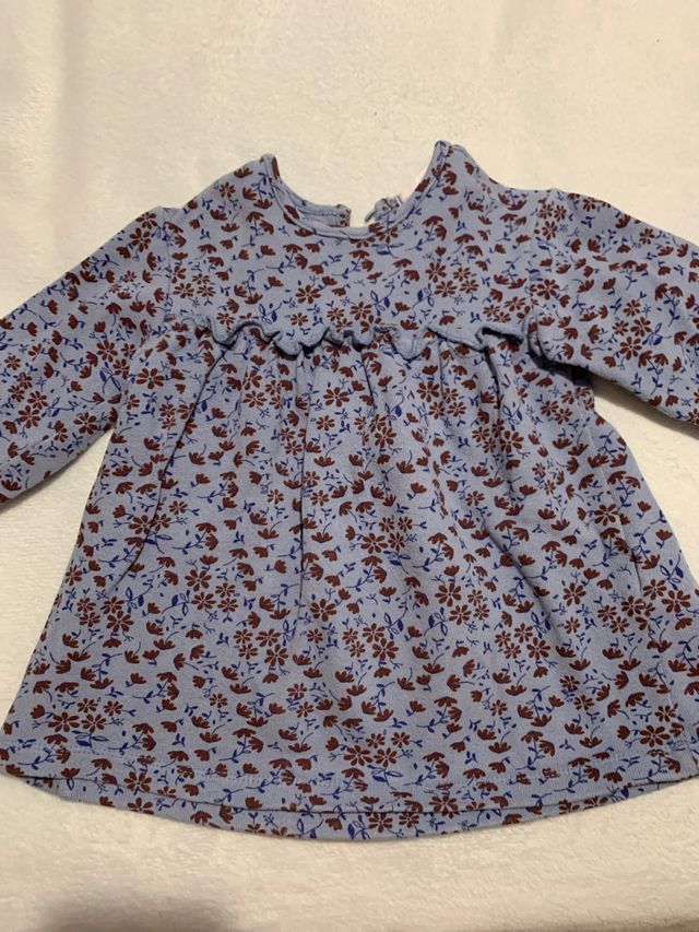 Vestido de manga larga para niña con un bonito estampado floral. - Base azul claro. - Flores en tonos burdeos y azul marino. - Volante en la zona del pecho.