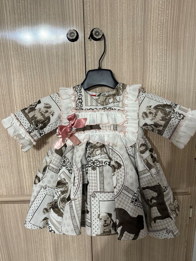 Vestido infantil con un bonito estampado de perros y detalles en rosa. - Manga corta con volantes. - Lazos decorativos en la parte delantera. - Cuello con volantes.