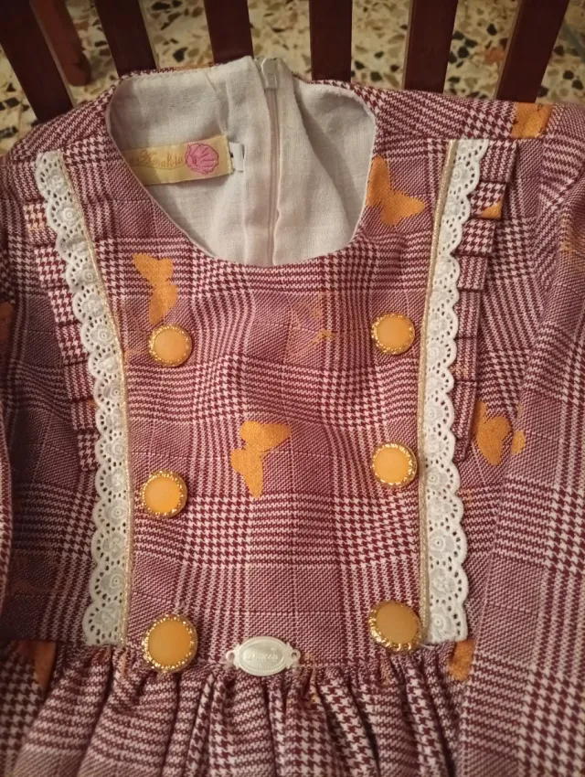 Detalles del productoVestido de niña con estampado de cuadros y detalles de mariposas.