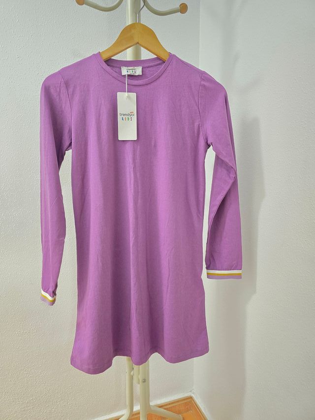 Vestido morado de manga larga para niña de la marca Trendyol. - Talla 10 años. - Puños con detalle de rayas amarillas y blancas. 📦Caja 1