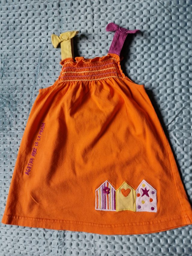 Color naranja con aplicación de casitas, tirante ancho con forma de lazo
