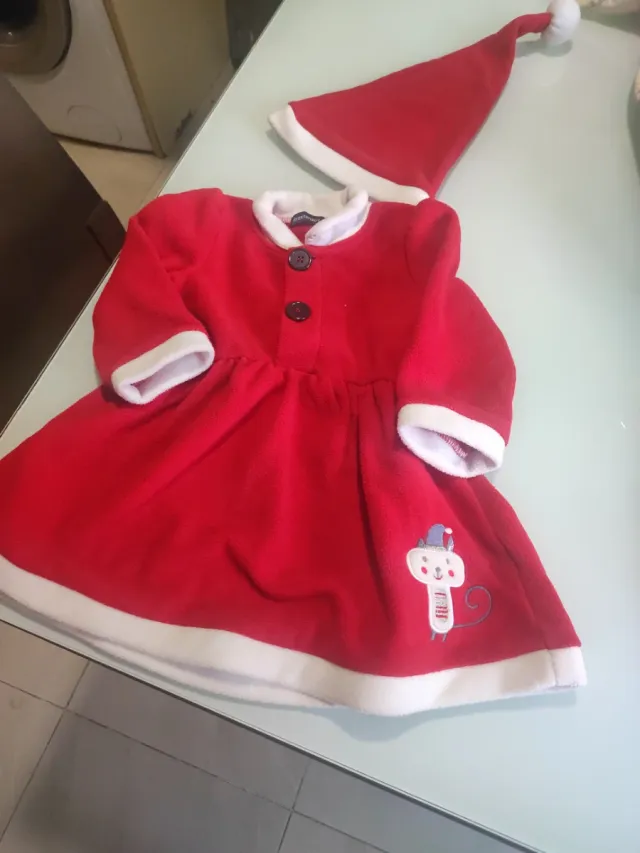 Conjunto de vestido y gorro de Papá Noel para niña. - Vestido rojo con detalles blancos. - Incluye gorro a juego. - Adorno de un ratón con gorro en la falda.
