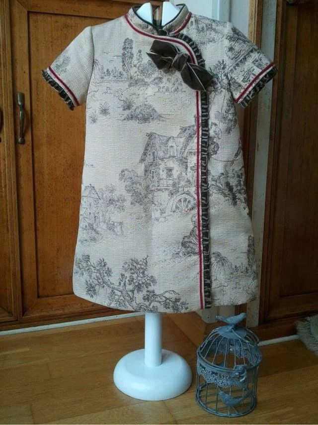 Vestido PICOLETTAS. Talla 5 años. Estampado camel y marrón en toile de jouy. Forrado. Combinado con terciopelo marrón y rojo. Impecable. Facilito medidas