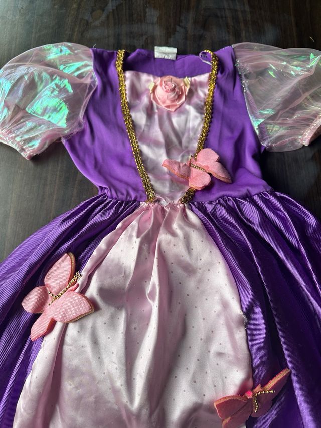 Detalles del productoVestido de princesa en color morado y rosa con detalles de mariposas.