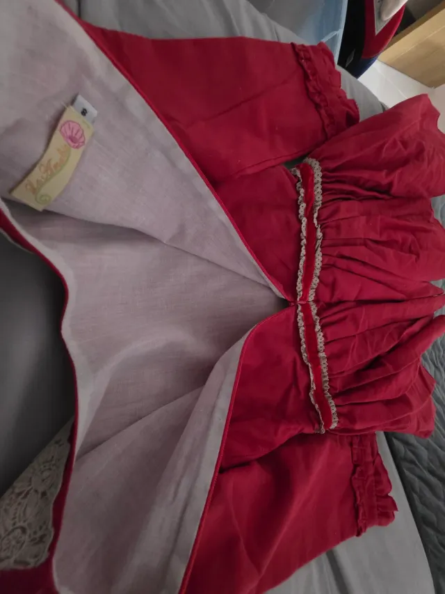 Vestido de color rojo con un diseño encantador. - Detalle de volantes en las mangas. - Adorno de pasamanería en la parte delantera. - Tejido ligero y cómodo.una vez puesto