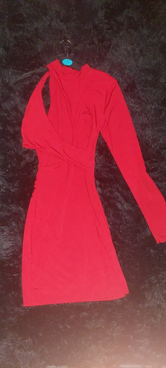 Vestido rojo fiesta asimétrico. Abertura escote.