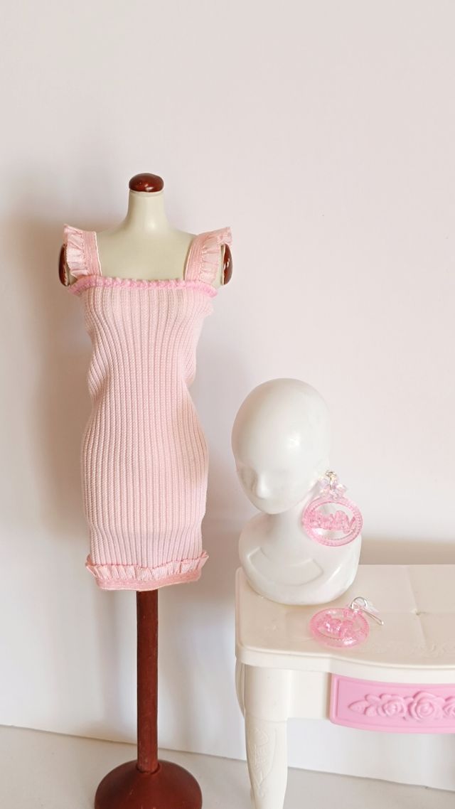 Detalles del productoVestido de punto rosa para muñeca Barbie, con detalles de volantes. Pendientes a juego