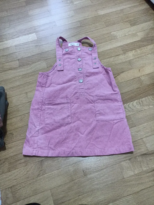 Vestido rosa de pana con botones. - Dos bolsillos delanteros. - Tirantes ajustables con botones. - Detalle de botones en la parte delantera.