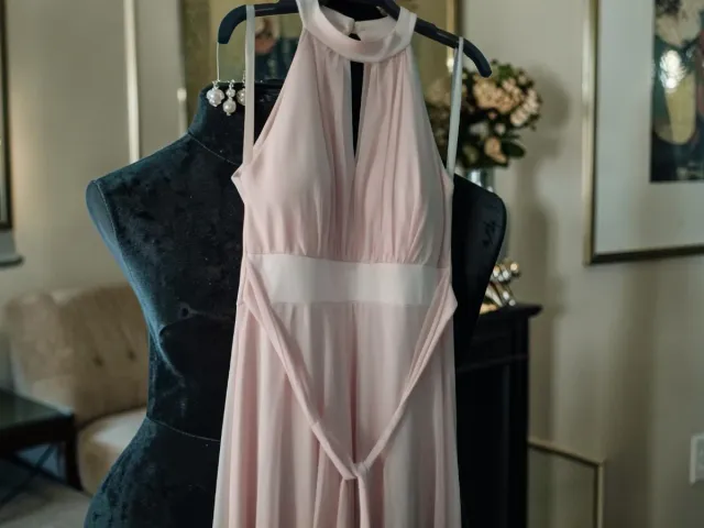 Elegante vestido largo en tono rosa, ideal para eventos especiales. Presenta un diseño con cuello halter y detalles drapeados en el corpiño.