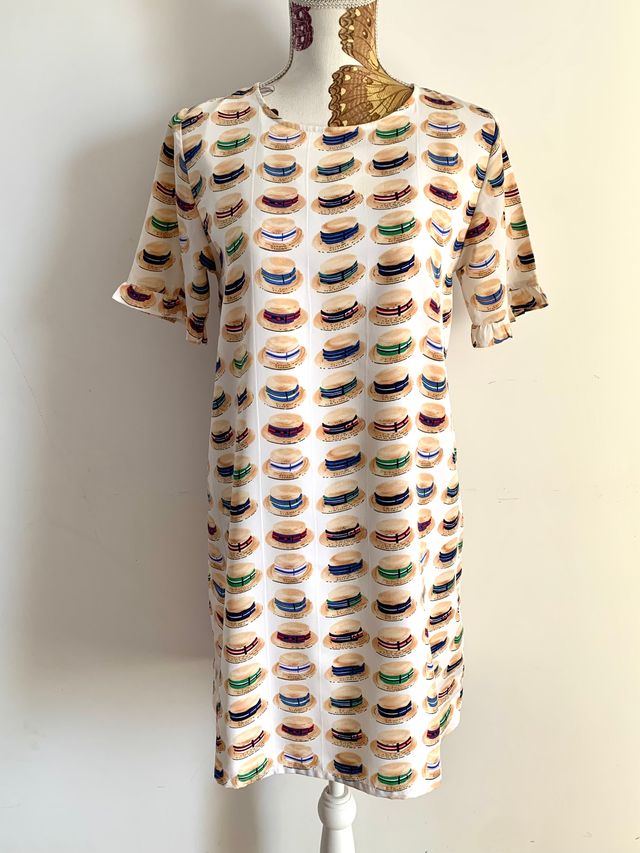 Vestido de la marca Compañía Fantástica. Estampado de sombreros sobre fondo beige claro. Manga corta. Tiene forro. Medidas: 37cm de hombros, 46cm de sisa a sisa y 83cm de largo. Talla M. Poco usado, como nuevo. NO NEGOCIABLE.