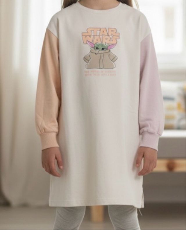 Vestido tipo sudadera con estampado de Star Wars. - Diseño con Bebé Yoda. - Mangas de diferentes colores: melocotón y lila. - Cuello redondo. - Indica talla 9/10