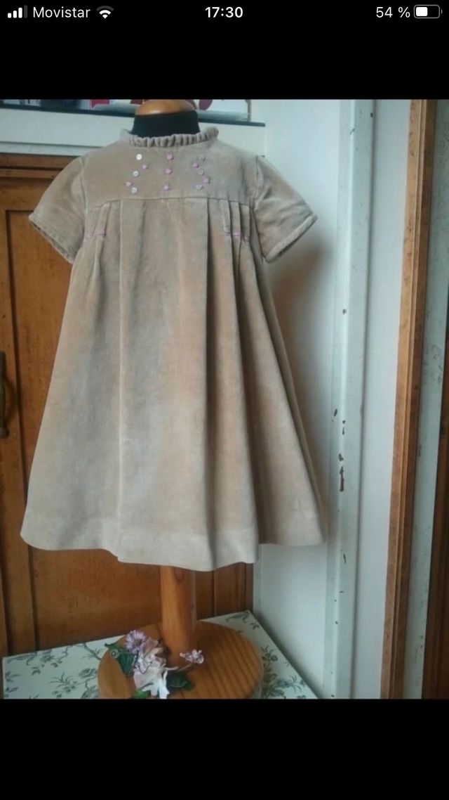 Vestido MIRANDA talla 24 meses. Terciopelo camel. Florecitas rosas bordadas en pecho. Botones espalda. Impecable. Forrado.