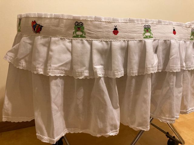 Hecho a mano. Motivos de animalitos cosidos a punto de cruz. Minicuna, moises