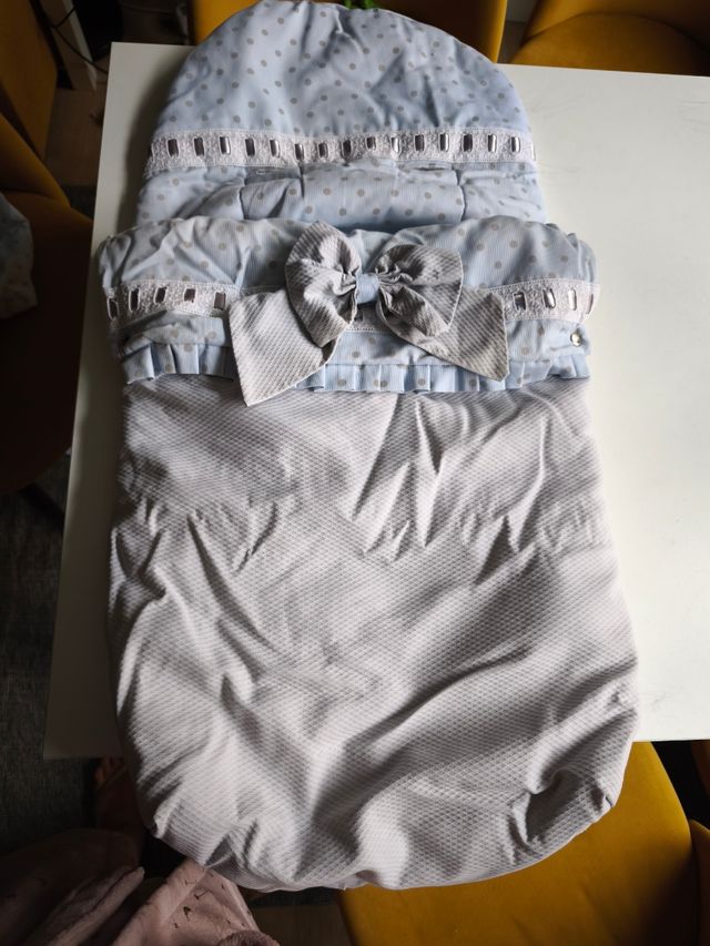 Vestiduras para carrito Bugaboo Camaleón 3. El conjunto incluye capota y saco. - Diseño con lunares azules y grises. - Adorno de lazo.