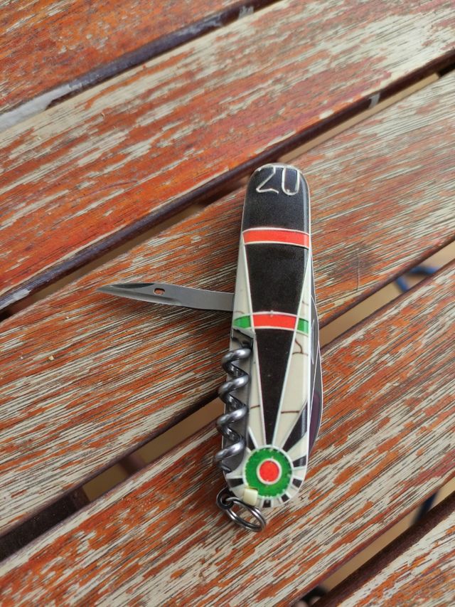 Espectacular navaja cuchillo multiusos de colección diana dardos,cachas en relieve rugosas.