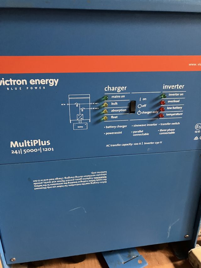 Inversor/cargador Victron Energy MultiPlus. - Modelo: 24/5000/120. - Voltaje de inversor: 230 V. - Capacidad de transferencia AC: 100 A.