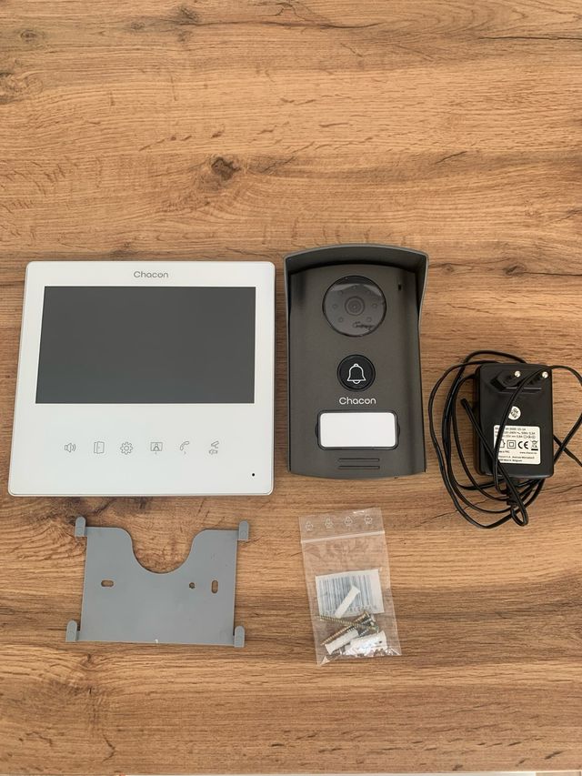 Detalles del productoVendo videoportero Chacon con pantalla de 7 pulgadas.  Es de color blanco y tiene un diseño ultraplano. Se incluye el videoportero, la placa exterior, ambos soportes de pared, los tornillos y el transformador.  El equipo está prácticamente nuevo, tiene dos meses de uso.