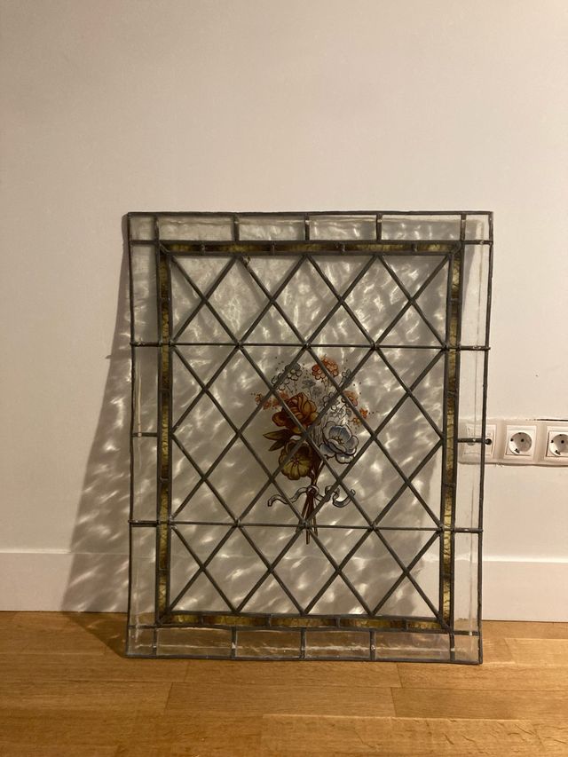 Detalles del productoVidriera antigua con un diseño de rombos y un ramo de flores pintado en el centro. Los bordes están rematados con un marco metálico y detalles dorados.