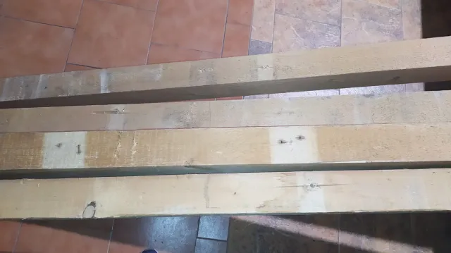 Detalles del producto2 vigas de 4,47 mts, 1 viga de 2,95 mts, 1 viga de 2,80 mts de 9,5 cm x 7,5 cm. Madera rústica.