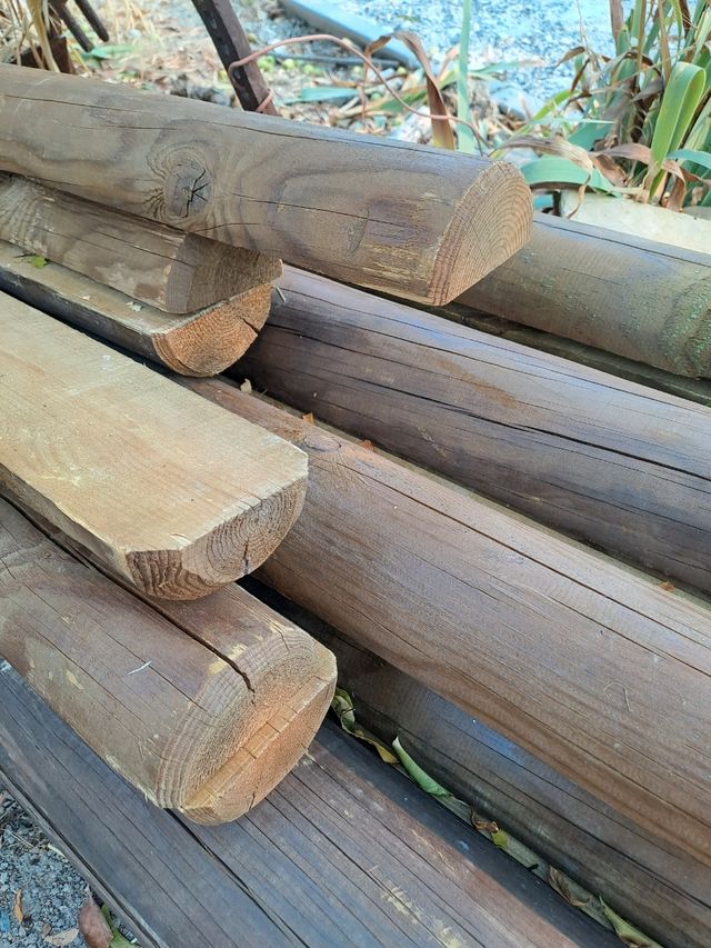 - 9 vigas cortadas por la mitad, de 12 cm de diámetro, y diferentes longitudes: