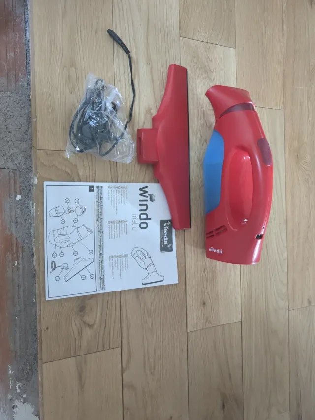 Detalles del productoLimpiacristales eléctrico Vileda Windo Matic en color rojo y azul. Incluye cargador y manual de instrucciones.