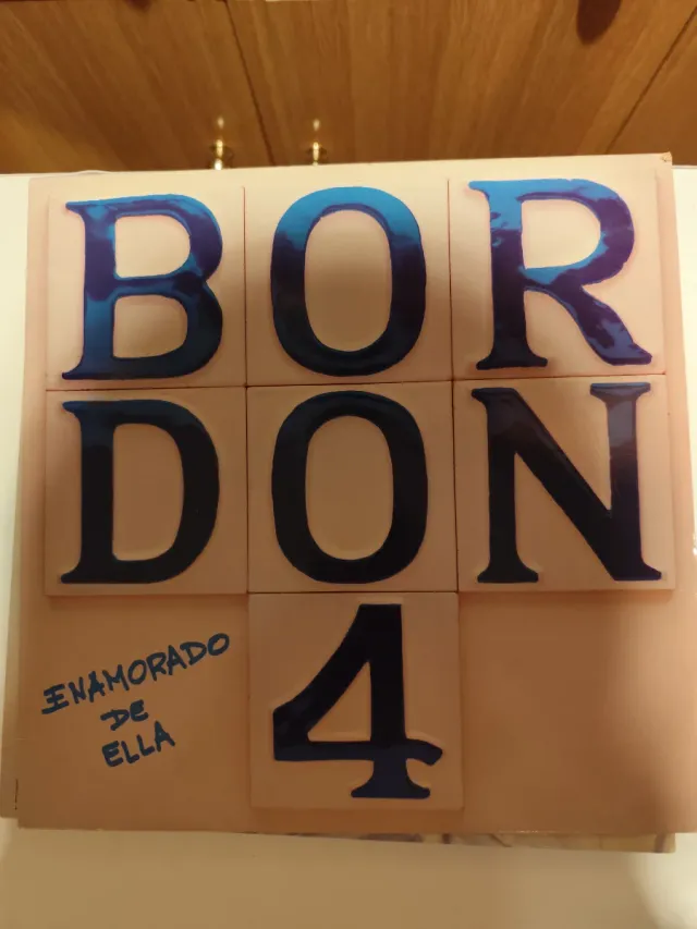 Vinilo con diseño de letras y número. - Letras B, O, R, D, O, N. - Número 4. - Inscripción ENAMORADO DE ELLA.