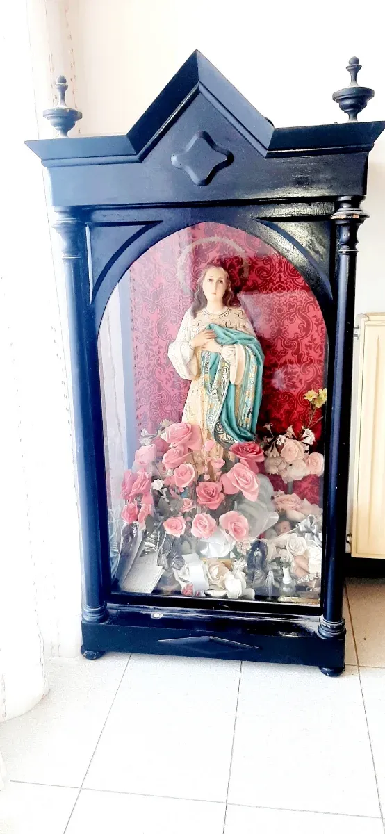 Figura de la Virgen en una vitrina decorada con flores. - Figura religiosa. - Base con flores rosas y blancas. - Vitrina con marco oscuro.