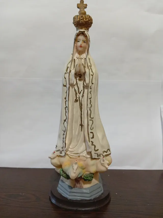 Figura religiosa de la Virgen de Fátima, con detalles en dorado.Mide 27 cm. - Corona dorada. - Rosario con cuentas. - Base con nubes y palomas.