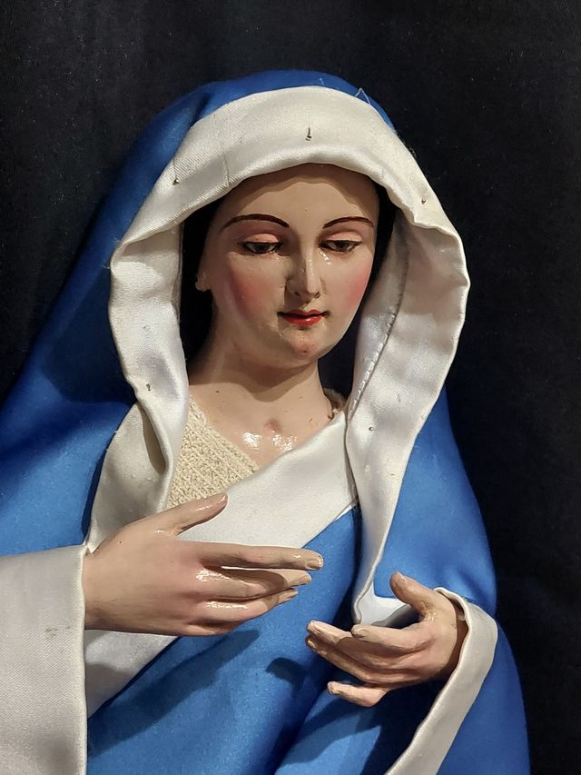 Detalles del productoFigura de la Virgen María de 55cm. Con brazos móviles y candelero de madera, se vende sin ropajes, para el envío la imagen iría desmontada del candelero para mayor seguridad. Mide 55cm.