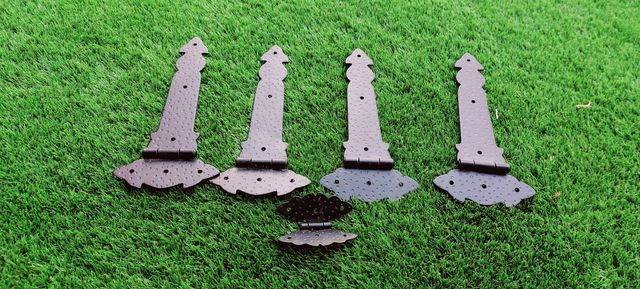 Detalles del productoJuego de cinco bisagras decorativas de color negro. Son ideales para darle un toque elegante a tus puertas o muebles. - Fabricadas con un material resistente. - Diseño con textura punteada. - Añaden un toque rústico y sofisticado. - Perfectas para proyectos de bricolaje o restauración.