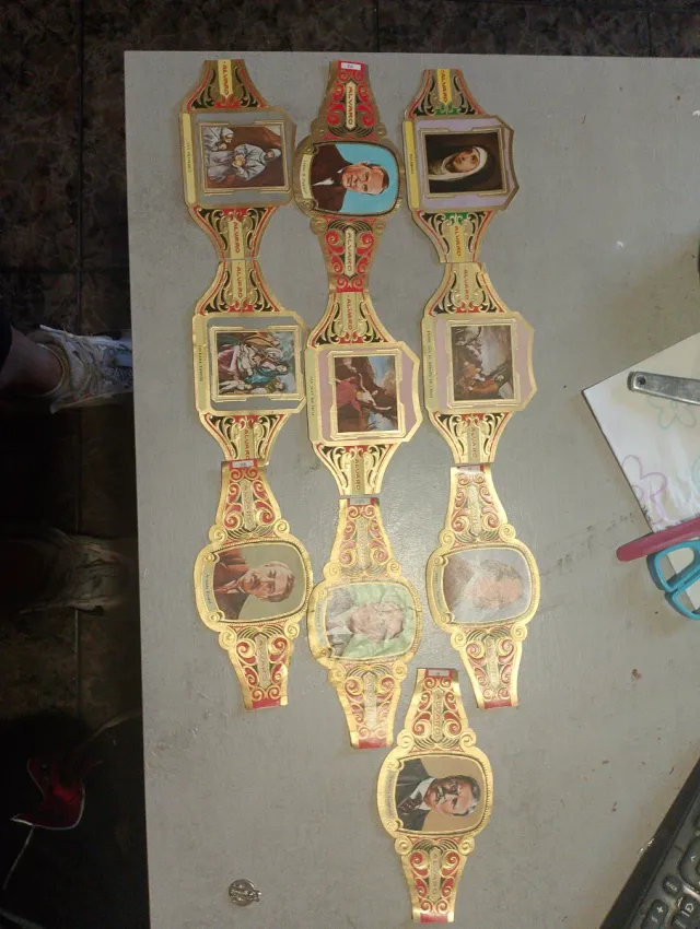 Colección de vitolas Álvaro con diseños detallados. - Cada vitola presenta una ilustración única. - Diseños dorados y rojos. - Ideal para coleccionistas.