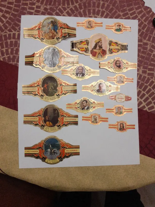 Detalles del productoColección de vitolas de puros de la marca Alvaro, procedentes de Canarias. Cada vitola presenta diseños variados y detalles dorados.