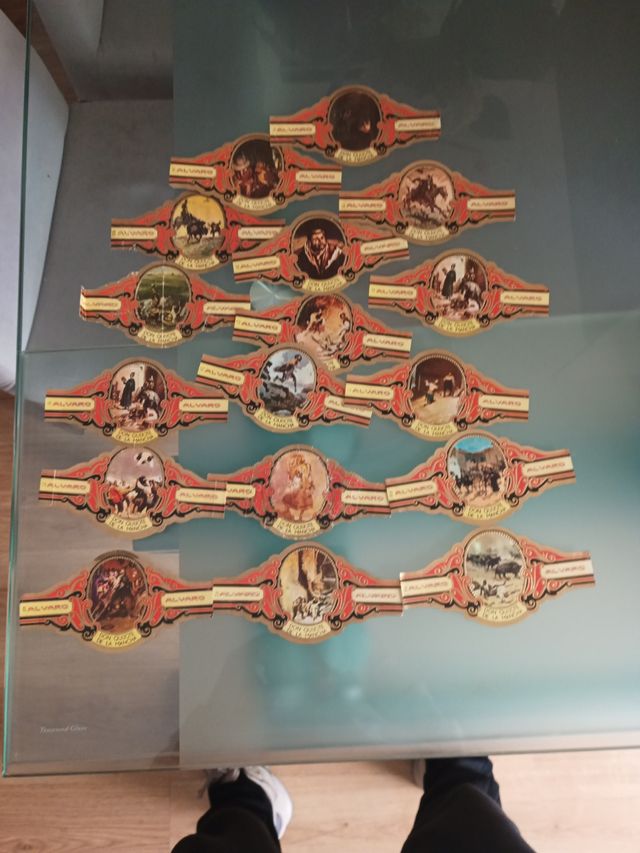 Colección de vitolas de Don Quijote de la Mancha. - Diseños inspirados en la obra literaria. - Cada vitola presenta una ilustración diferente. - Marca: Alvaro. 17 unidades
