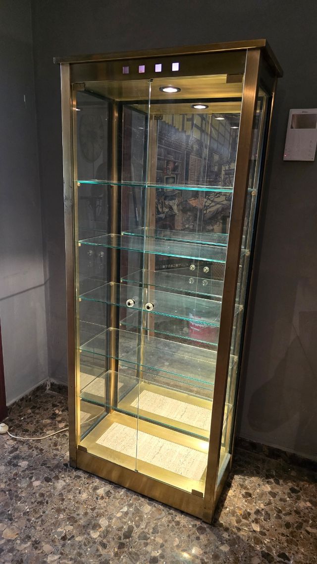 Detalles del productoVitrina / armario vertical de latón con cinco estantes de cristal ajustables y parte trasera interior espejada (¡esto dificulta la fotografía!). Es incluso mejor en persona. Construcción de gran calidad, posiblemente de Pace o Ello. Completamente original y en muy buen estado. Iluminado desde arriba. Medidas del producto