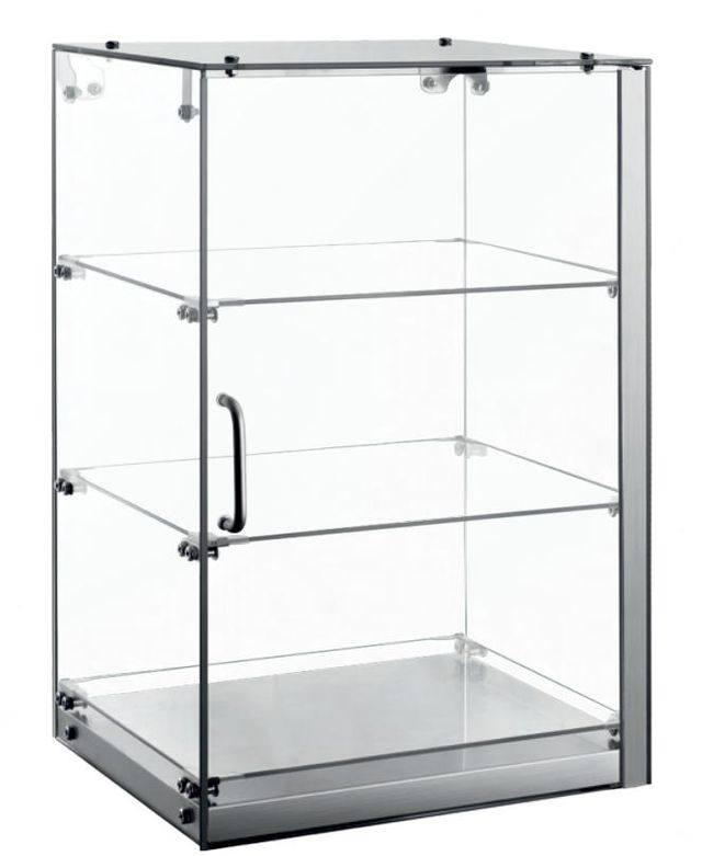 Detalles del productoVitrina expositora de cristal con estructura de acero inoxidable. Ideal para negocios.