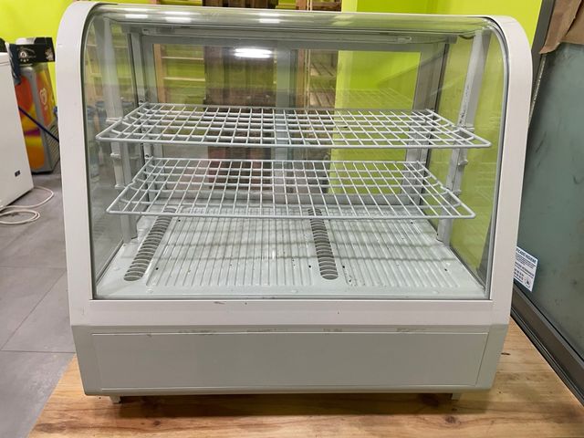 Vitrina refrigerada con diseño curvo y estantes. - Estructura blanca. - Dos estantes interiores. - Base con rejilla.