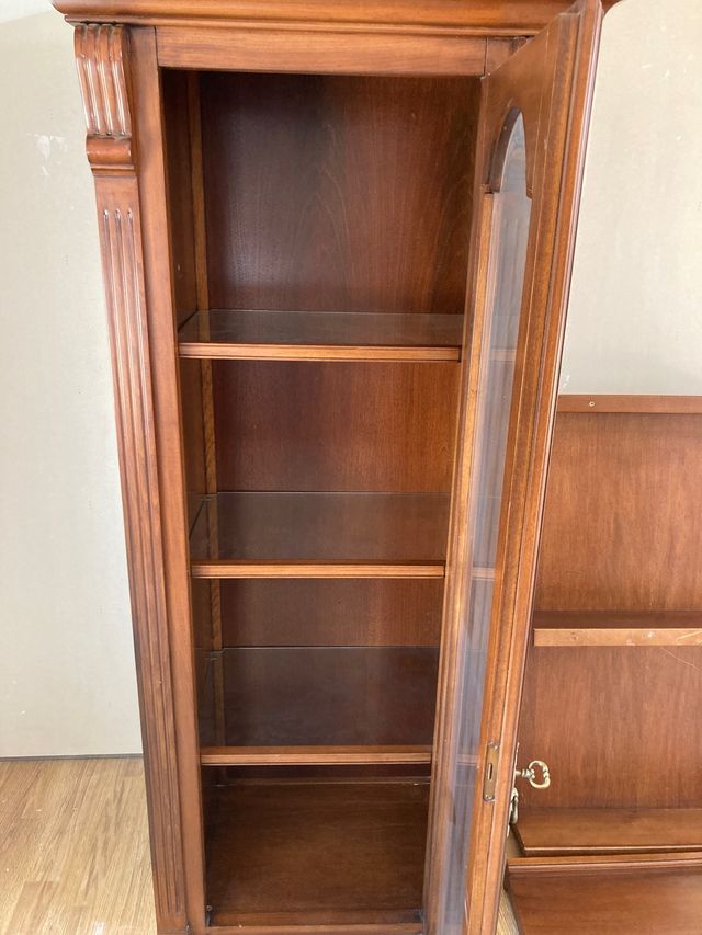 Conjunto de vitrina de madera maciza y cristal.
