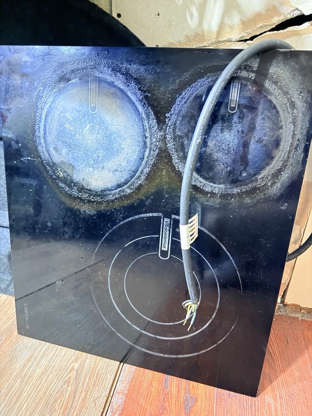 Placa vitrocerámica de dos fuegos. - Superficie de cristal negro. - Marca Vitroceramica. (cristal desgastado pero funcionamiento perfecto, se da con conectores de enchufe)