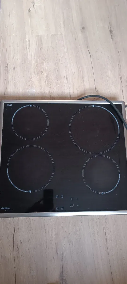 Detalles del productoVitrocerámica de cuatro zonas de cocción con acabado en cristal negro y marco metálico.