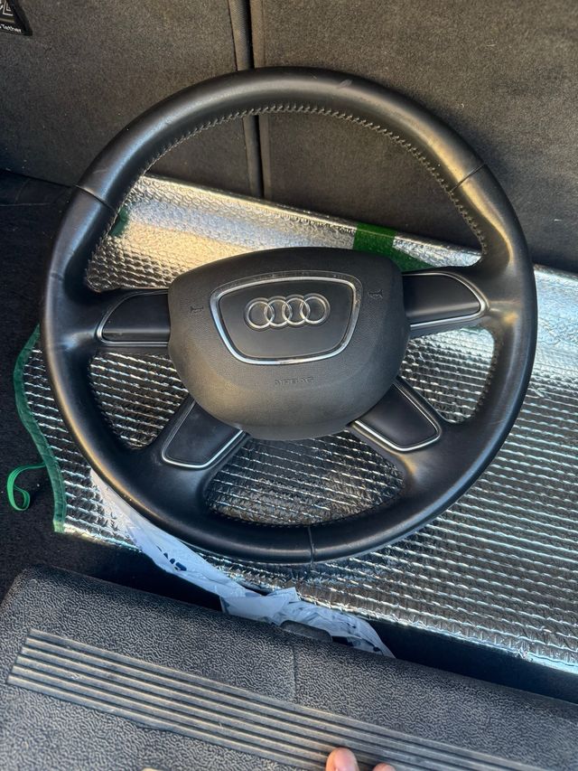 Volante de cuero negro para Audi A3 8V del año 2014. - Diseño deportivo con detalles plateados. - Logo de Audi en el centro.
