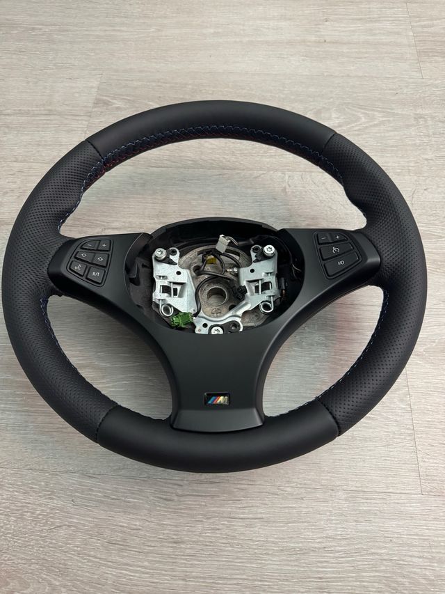 Volante M deportivo para BMW X3 modelo E83 a estrenar. - Diseño M con costuras azules y rojas. - Material de cuero perforado y liso. - Botones multifunción integrados.