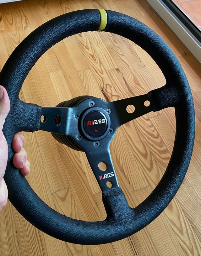 Detalles del productoSe vende volante desplazado de de color negro, de piel, con guía amarilla, costuras en negro y claxon. Tiene 350mm de diámetro y 65 Mm de desplazamiento. Está a estrenar, no se ha usado nunca. No se hacen envíos.