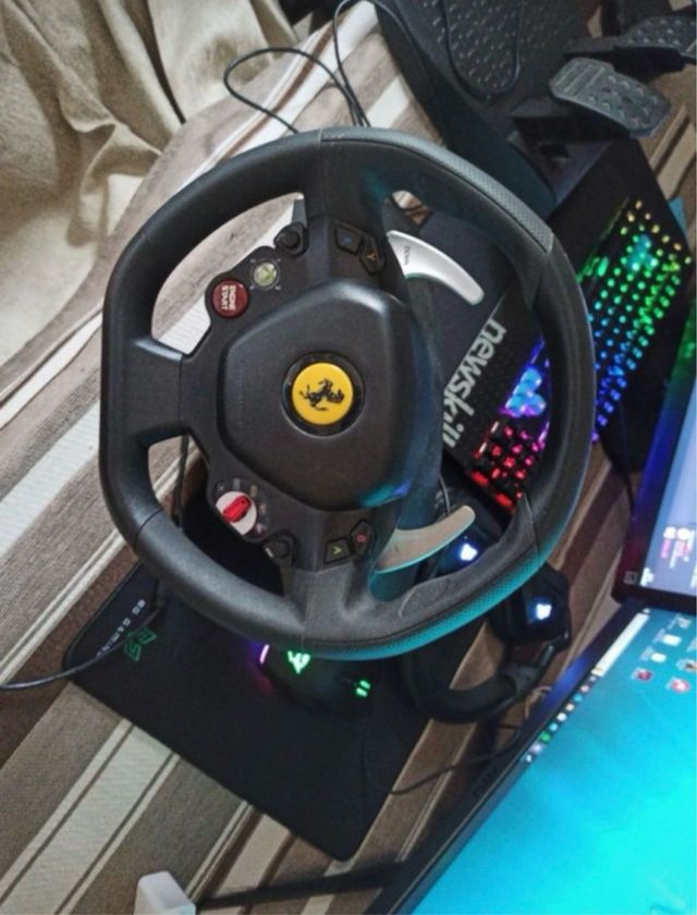 Detalles del productoVolante y pedales de la marca Ferrari, compatible con Xbox y PC. Ideal para una experiencia de simulación de conducción.