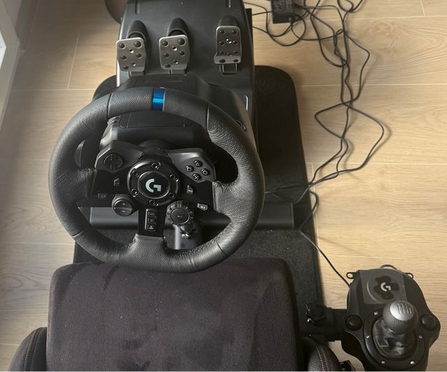 Pack de volante Logitech para PS5 y silla gaming. - Volante de cuero. - Pedales incluidos. - Palanca de cambios. - Silla con asiento acolchado.