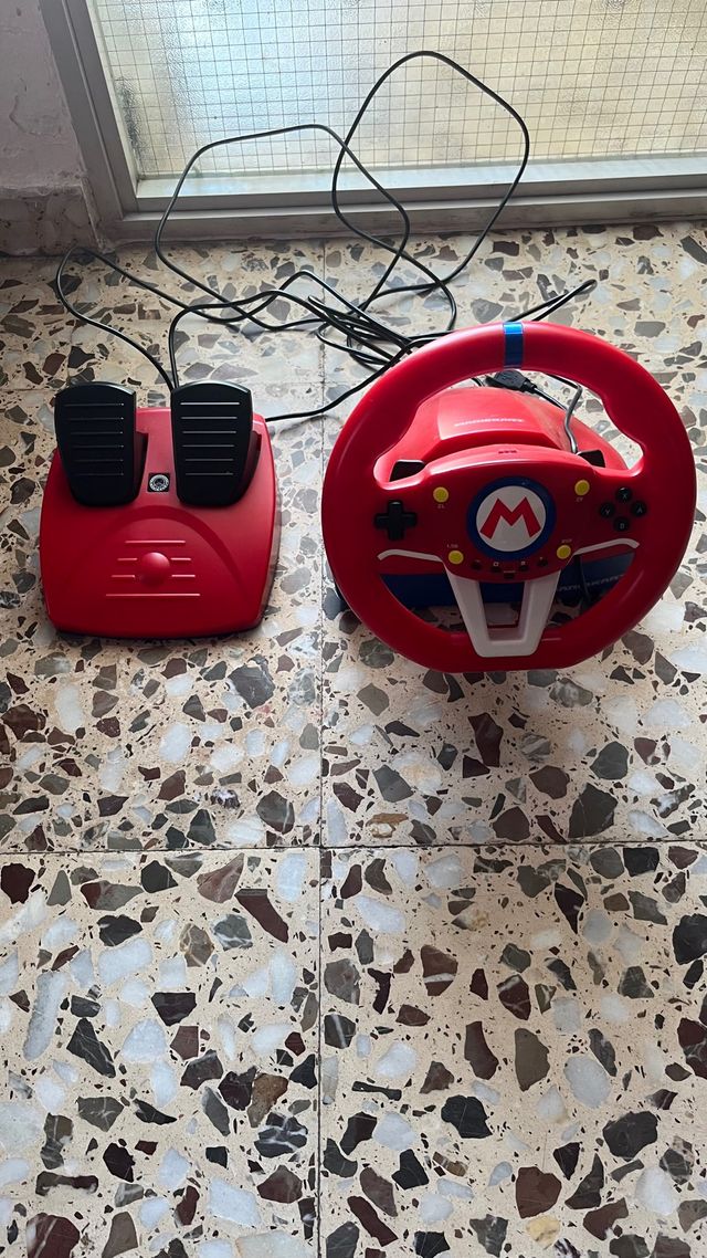 Volante de carreras con pedales, inspirado en Mario Kart. - Diseño en color rojo. - Incluye pedales. - Conexión por cable.