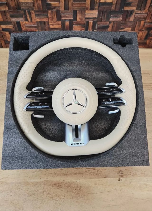 Volante deportivo Mercedes Benz AMG. - Diseño ergonómico y perforado. - Acabado en cuero. - Logo AMG en la parte inferior.