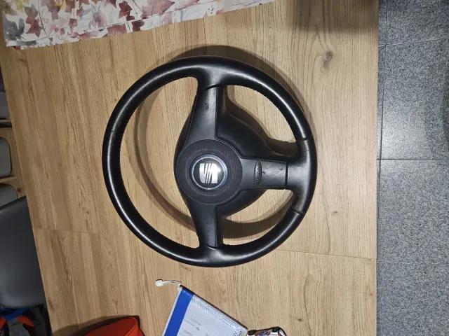 Volante original para SEAT León MK1 con airear. Pieza de repuesto en buen estado. - Diseño deportivo en color negro. - Logo de SEAT en el centro.
