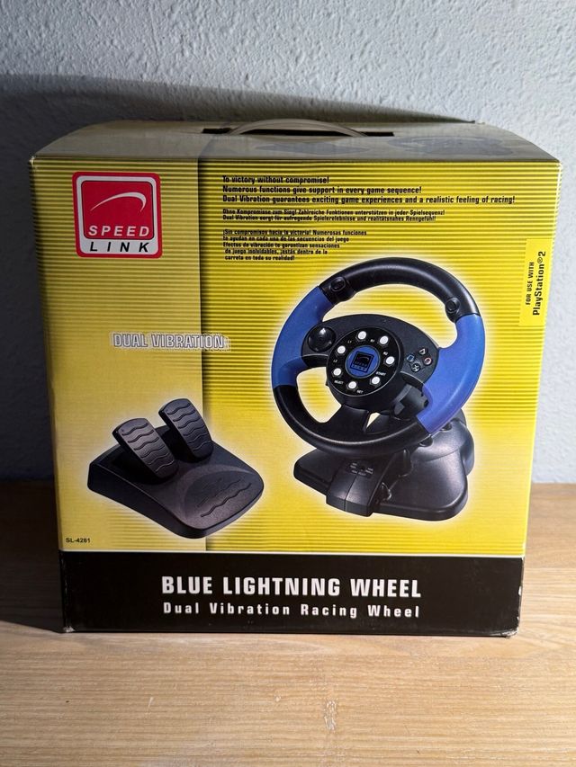 Detalles del productoVolante de carreras Blue Lightning para PlayStation 2. Incluye pedales y ofrece doble vibración para una experiencia de juego inmersiva.