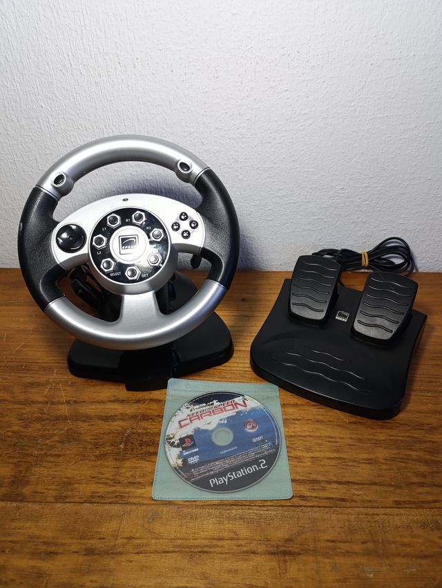 Detalles del productoVolante y pedales compatibles con la consola PlayStation 2. Como puede verse en general en buen estado. Funcionan correctamente. Además se incluye el juego Need For Speed Carbon (tiene una parte detrás tocada pero funciona correctamente). Es un volante con levas.